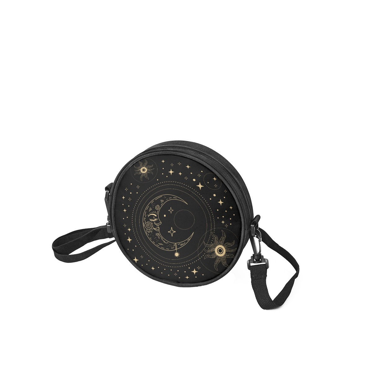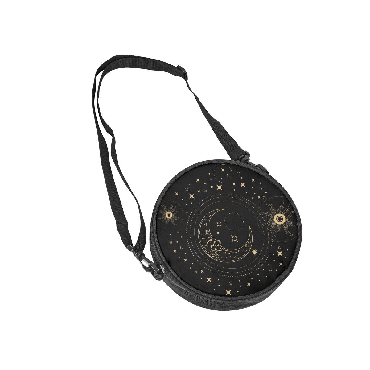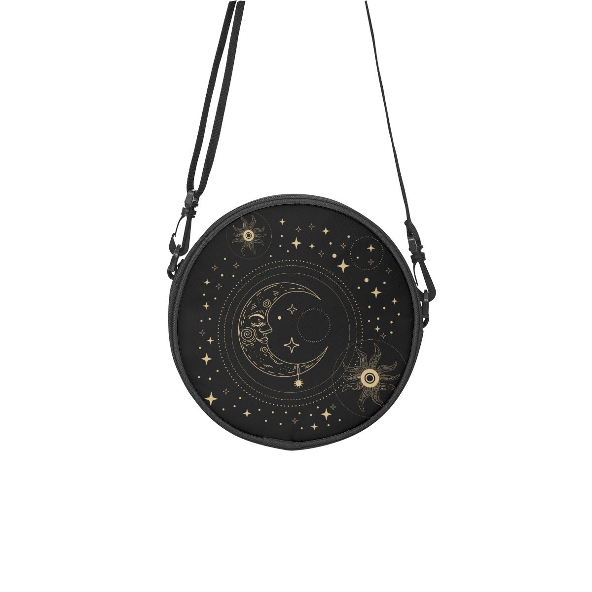Black Round Bag with Moon and Sun Motif in Boho Gothic Style